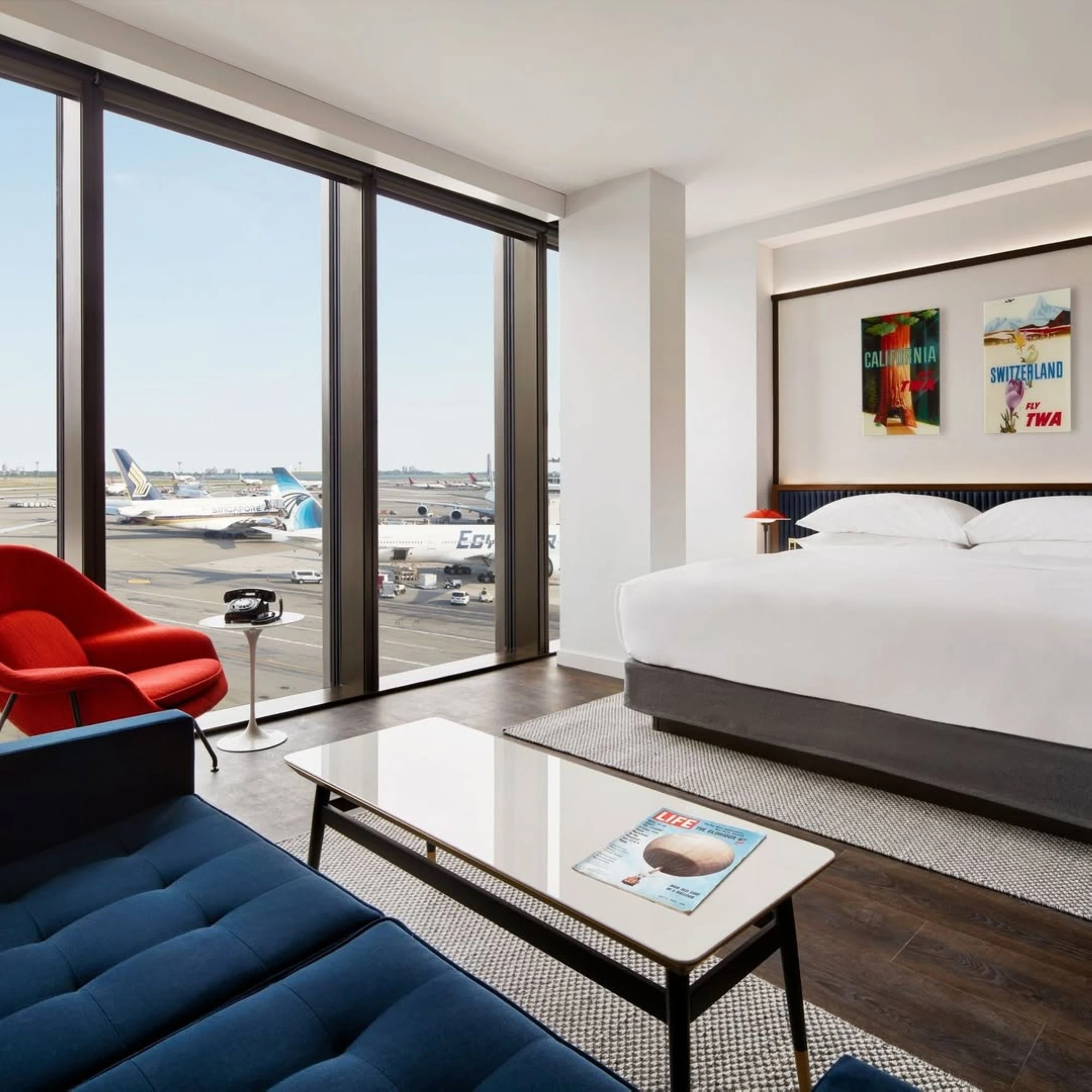 يوفر فندق TWA في مطار جون إف كيندي في نيويورك للمسافرين فرصة فريدة للإقامة وسط أجواء مصممة على الطراز القديم. وهو يقع في مركز TWA للطيران الذي تم تجديده سابقاً. ويرتبط الفندق بشكل مباشر بالمبنى 5، ما يجعله أحد أكثر فنادق المطارات حرصاً على راحة الزوار. وهنا، يمكن هؤلاء المشي، انطلاقاً من مكان استلام الأمتعة، والوصول إلى الفندق خلال مدة لا تتجاوز الدقائق القليلة عبر أنابيب الطيران الشهيرة التي صممها إييرو سآرينن. وماذا عن التنقل بين الأبنية؟ يقدم مطار جون إف كيندي للزوار خدمة AirTrain المجانية التي تؤمن نقلهم إلى الأبنية، مساحات ركن السيارات، ومرافق النقل العام.